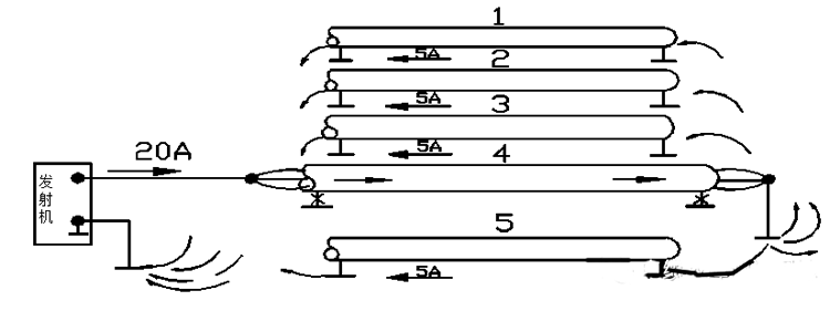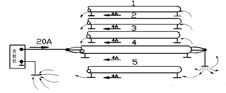 由于電纜屏蔽層通常與地相連,如果電纜束中,其它電纜也接到公共地上,發(fā)生器上黑色輸出插孔可連到公共地上,返回電流在幾根電纜屏蔽層進行分配,將返回電流分成許多支流,意味著被識別電纜的差值電流較大,有用信號較清楚,“差值”的意思是輸出電流和其分得的返回電流在同一通道內。如圖4所示,圖4中有5根電纜,4號電纜是我們需要識別的,要識別的電纜中“輸出電流”為20A。假設返回電流在所有電纜的屏蔽層中平均分配,在要測的電纜中應有4A的返回電流,要識別的電纜中的差值為:20A(輸出)-4A(返回)=16A(差值)